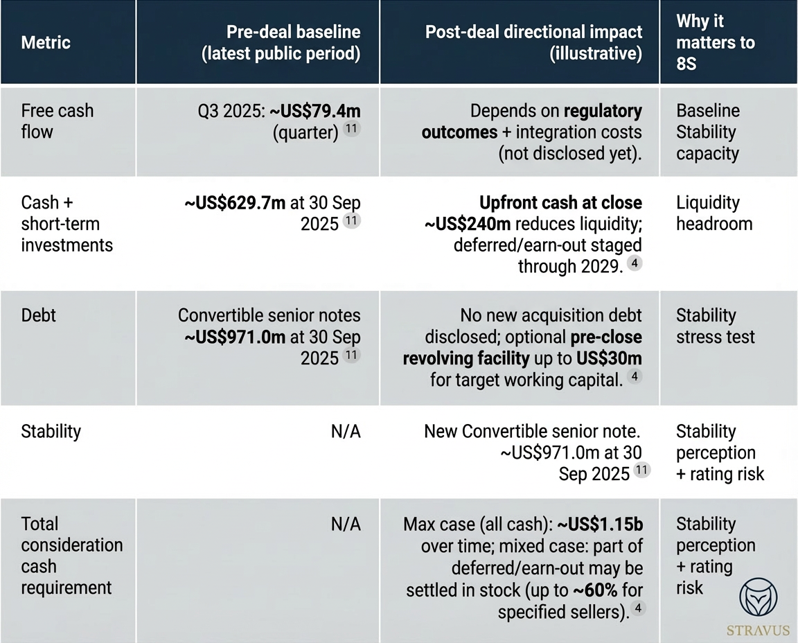 Funding and form: ~US$240m cash payable at close; ~US$710m deferred over 18 months; up to ~US$200m earn‑out tied to revenue and adjusted EBITDA targets through fiscal years 2026–2028 (payable after annual results).