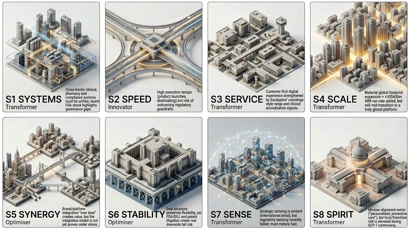 The acquisition reflects strategic sensing: Hims is attempting to reduce geographic concentration and strengthen its appeal as a scaled distribution partner for treatments and diagnostics. Yet the GLP‑1 pill episode exposed a gap in regulatory sensing - the ability to anticipate enforcement posture, not just consumer demand. Sense is therefore mid‑high maturity, but not at “always‑on, ahead‑of‑regulator” level.