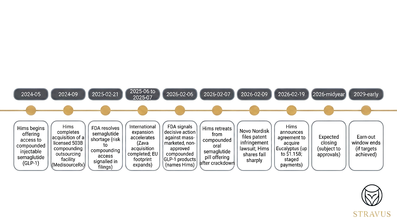 Given the regulatory shock in the U.S. (and the market’s repricing of HIMS accordingly), the deal’s strategic sense hinges on whether Eucalyptus reduces the firm’s regulatory concentration risk - or unintentionally amplifies it. Australian reporting has argued Eucalyptus has increasingly concentrated on weight loss/GLP‑1, which would make this less of a diversification play and more of a global scaling bet on the GLP‑1‑enabled consumer health category.