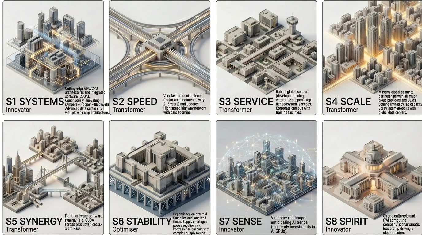 Profile: NVIDIA is an overall High Transformer, with Innovator peaks in Systems, Sense, Spirit. The key imbalance is Speed/Scale vs. Stability: NVIDIA’s aggressive growth ambitions put pressure on its supply-chain and execution.